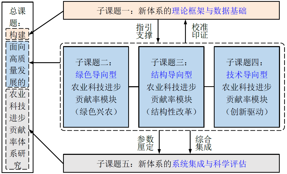本课题以构建面向高质量发展的农业科技进步贡献率体系为主线,在把握高质量发展迫切需求和中国农业科技进步贡献率测算方法现状的基础上,构建面向高质量发展的农业科技进步贡献率体系的理论与数据基础。在此基础上,开发“绿色导向型”、“结构导向型”和“技术导向型”三个农业科技进步贡献率模块,最后通过系统集成三个模块得到完整的农业科技进步贡献率体系并进行相应的测算与评价。