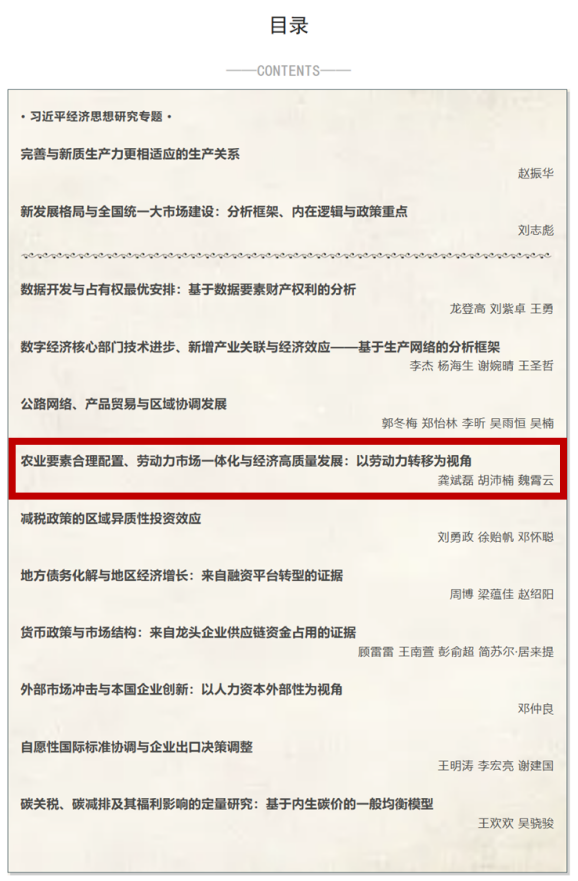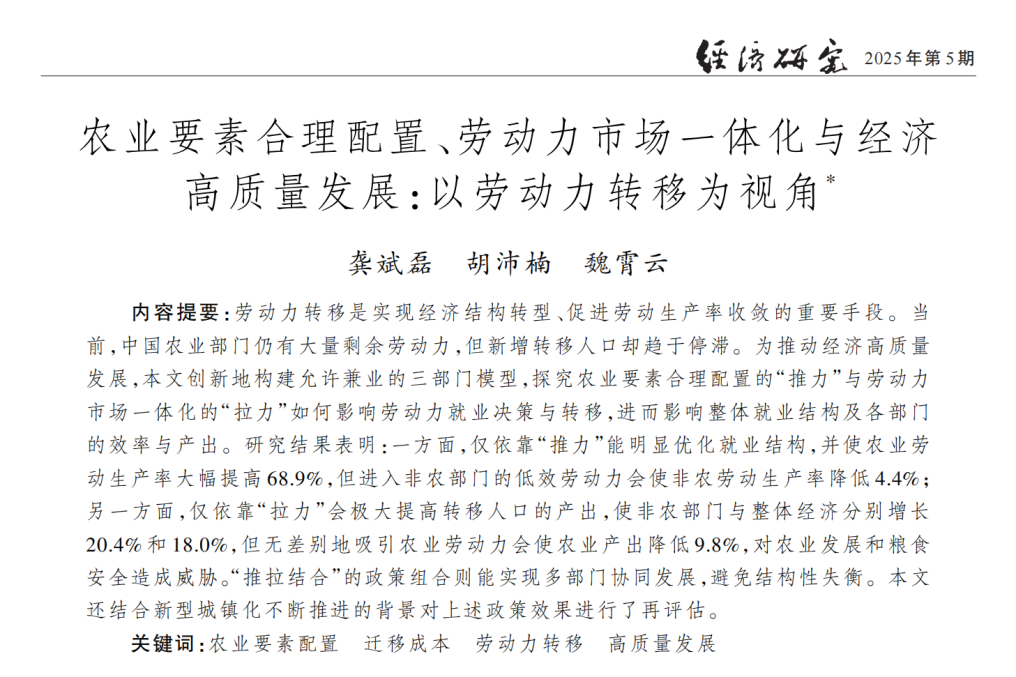 论文信息:龚斌磊、胡沛楠、魏霄云:农业要素合理配置、劳动力市场一体化与经济高质量发展:以劳动力转移为视角.《经济研究》2025年第5期,第89-106页。