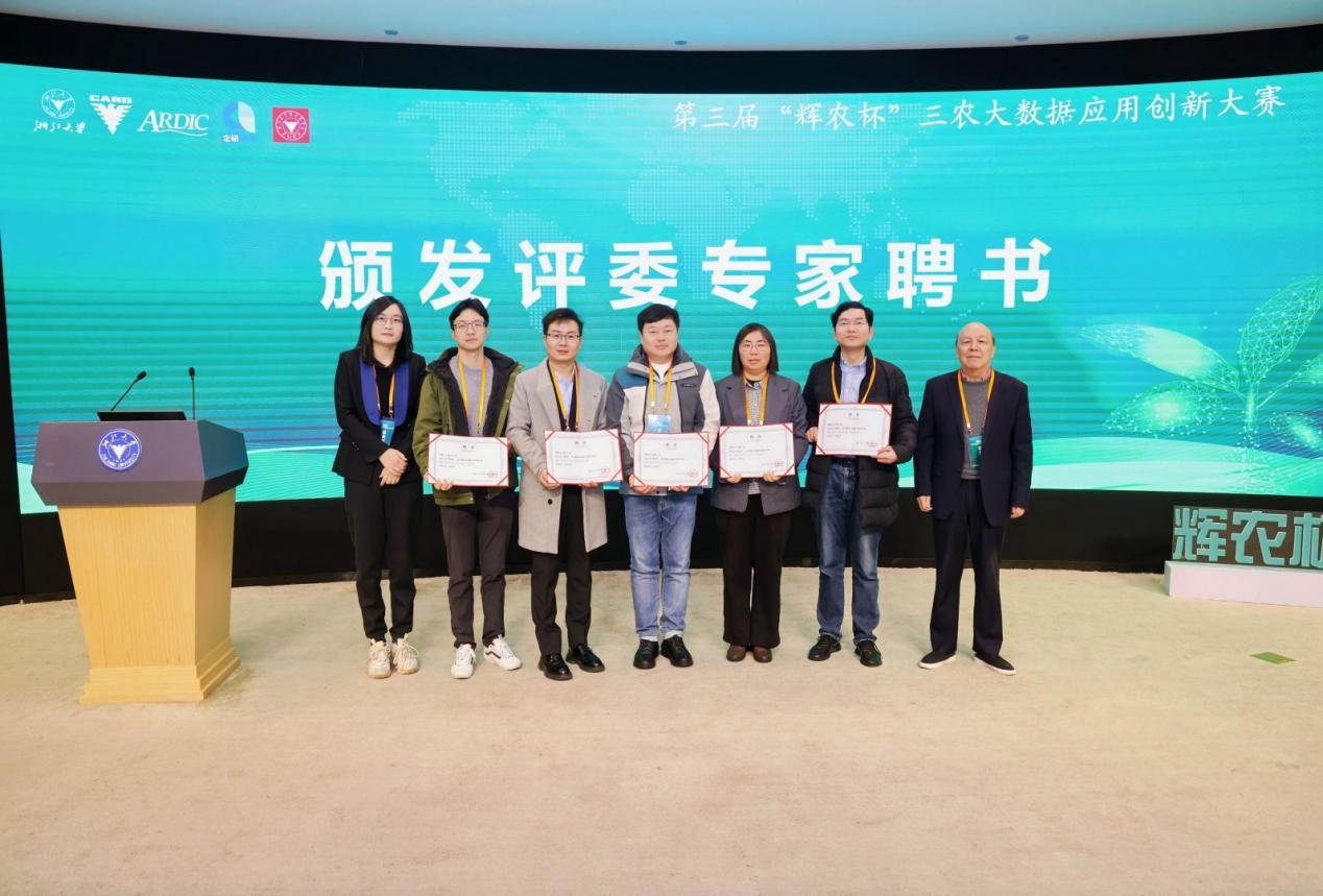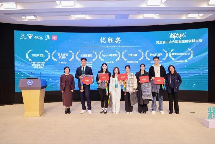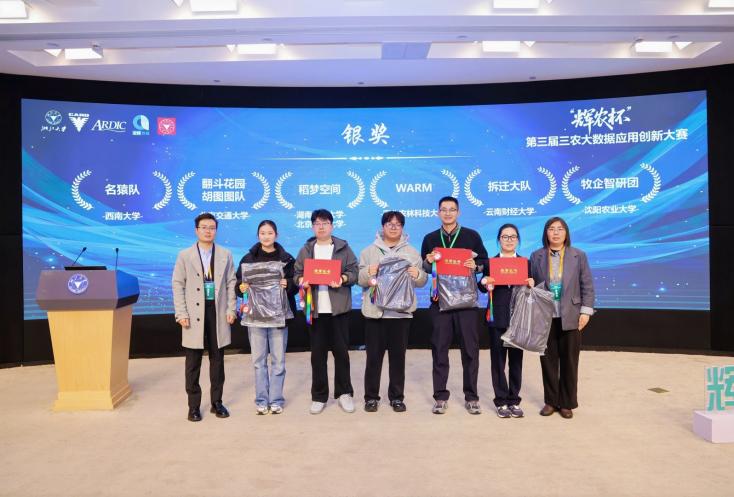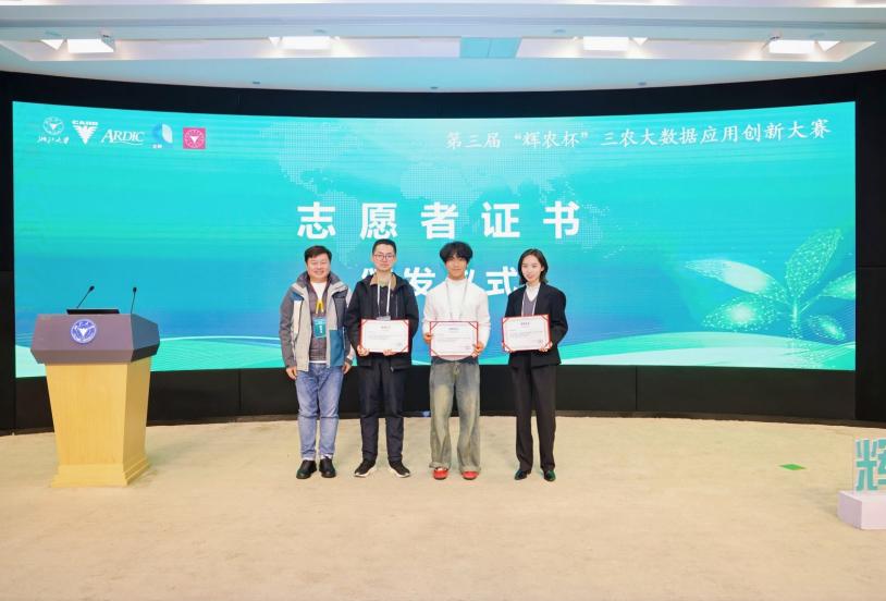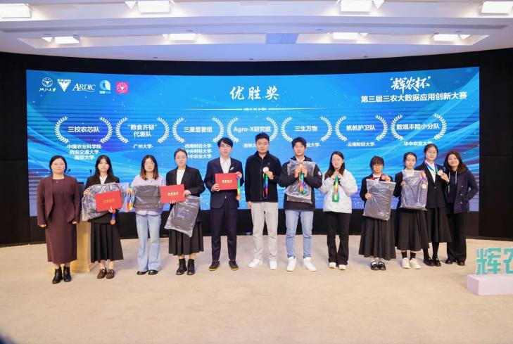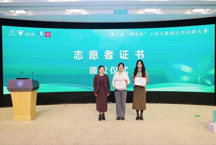 下午闭幕式上,浙江大学中国农村发展研究院院长助理胡伟斌发表致辞。经过一天的激烈角逐,第三届“辉农杯”三农大数据应用创新大赛总决赛最终产生了特等奖1项,金奖3项,银奖6项,优胜奖7项。其中,西南大学参赛队伍摘得桂冠,评委们为获奖选手颁发奖牌与证书。随后,承办方浙江大学公管学院数智三农实验室副主任鄢贞,百人计划研究员林雯等还为幕后辛勤工作的学生工作人员颁发了荣誉证书。至此,以“数聚农业新质 智绘乡村未来”为主题的第三届“辉农杯”三农大数据应用创新大赛总决赛圆满闭幕。