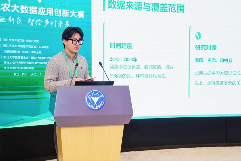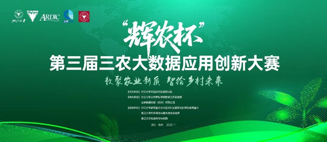 2025年11月22日,第三届“辉农杯”三农大数据应用创新大赛决赛在浙江大学紫金港校区蒙民伟楼智云报告厅盛大举行。此次大赛由浙江大学中国农村发展研究院主办,浙江大学公共管理学院数智三农实验室与企研数据科技(杭州)有限公司联合承办,浙江大学教育基金会中国农村发展研究院辉农教育基金、浙江大学包容智治与城乡融合实验室和浙江大学社会科学研究院共同支持。大赛旨在以赛促学、以赛促研,鼓励青年学子探索数字技术赋能农业全产业链韧性提升、乡村多元价值实现的创新路径,为推动农业农村现代化、实现乡村全面振兴与共同富裕贡献智慧力量。