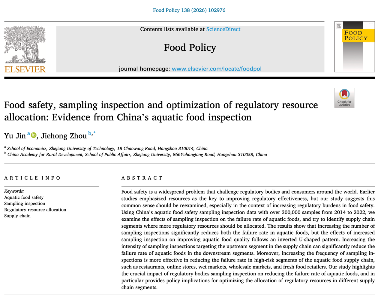 浙江大学中国农村发展研究院周洁红教授与浙江工业大学经济学院金宇特聘副研究员合作撰写的学术论文“Food safety, sampling inspection and optimization of regulatory resource allocation: Evidence from China’s aquatic food inspection”于2025年10月23日在Food Policy在线发表。Food Policy是农业经济领域的权威学术期刊,同时位于经济学大类、农业经济与政策领域、营养和膳食领域以及食品科学与技术领域Q1区,最新影响因子6.0。