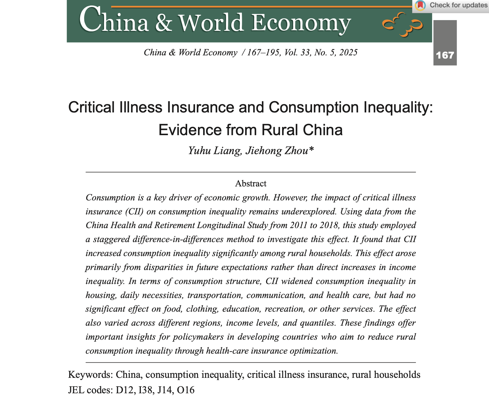 Liang Y, Zhou J. Critical Illness Insurance and Consumption Inequality: Evidence from Rural China[J]. China & World Economy, 2025, 33(5): 167-195. https://doi.org/10.1111/cwe.12610.