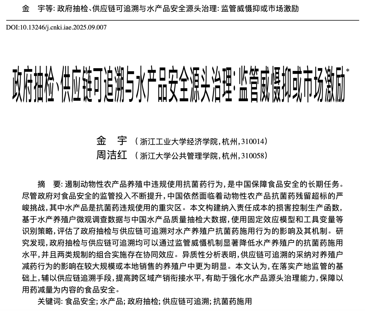 浙江大学中国农村发展研究院周洁红教授与浙江工业大学经济学院金宇特聘副研究员撰写的学术论文“政府抽检、供应链可追溯与水产品安全源头治理:监管威慑抑或市场激励”于2025年10月15日在《农业经济问题》在线发表。《农业经济问题》是农业经济领域的中文高水平刊物,国家自然科学基金委员会管理科学部认定的A类期刊,根据《中国学术期刊影响因子年报(人文社会科学·2024版)》数据,最新复合影响因子12.876,在57种农业经济学术期刊中排名第2位。