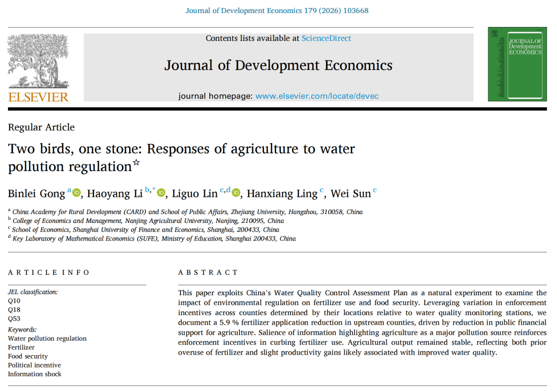 近日,浙江大学中国农村发展研究院常务副院长龚斌磊教授与南京农业大学李昊洋教授、上海财经大学林立国教授、孙韦副教授等合作的论文“Two birds, one stone: Responses of agriculture to water pollution regulation”在发展经济学顶刊Journal of Development Economics正式发表。该研究成果系龚斌磊教授主持的国家自然科学基金(基金号:72161147001, 72173114)和教育部哲学社会科学重大项目(基金号:2024JZDZ059)的阶段性成果。